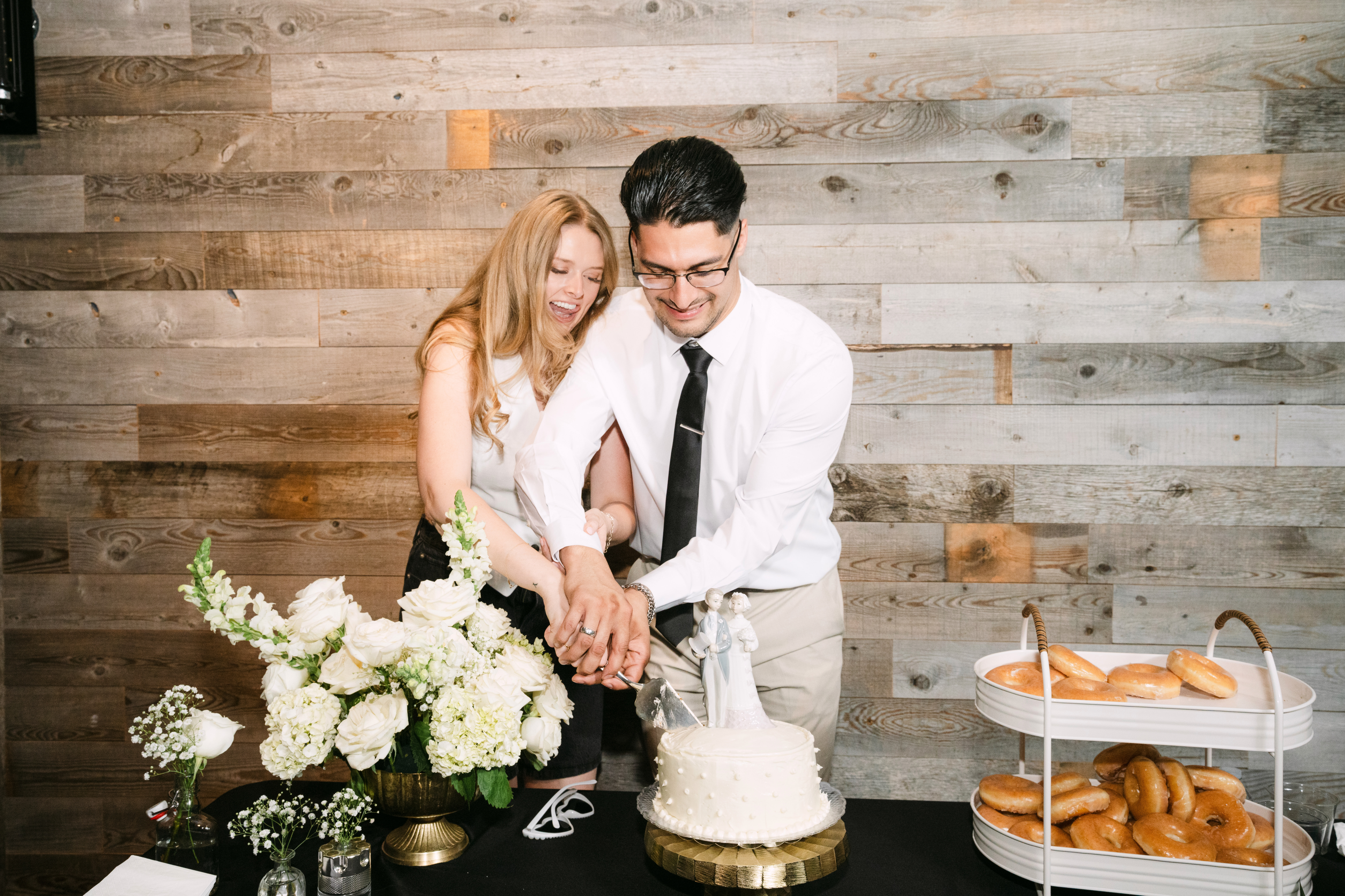 The couple opted for a classic and crisp color palette of white and green with gold accents. This choice perfectly complemented our venue’s versatile aesthetic, allowing their DIY floral arrangements and personal heirlooms to truly shine.