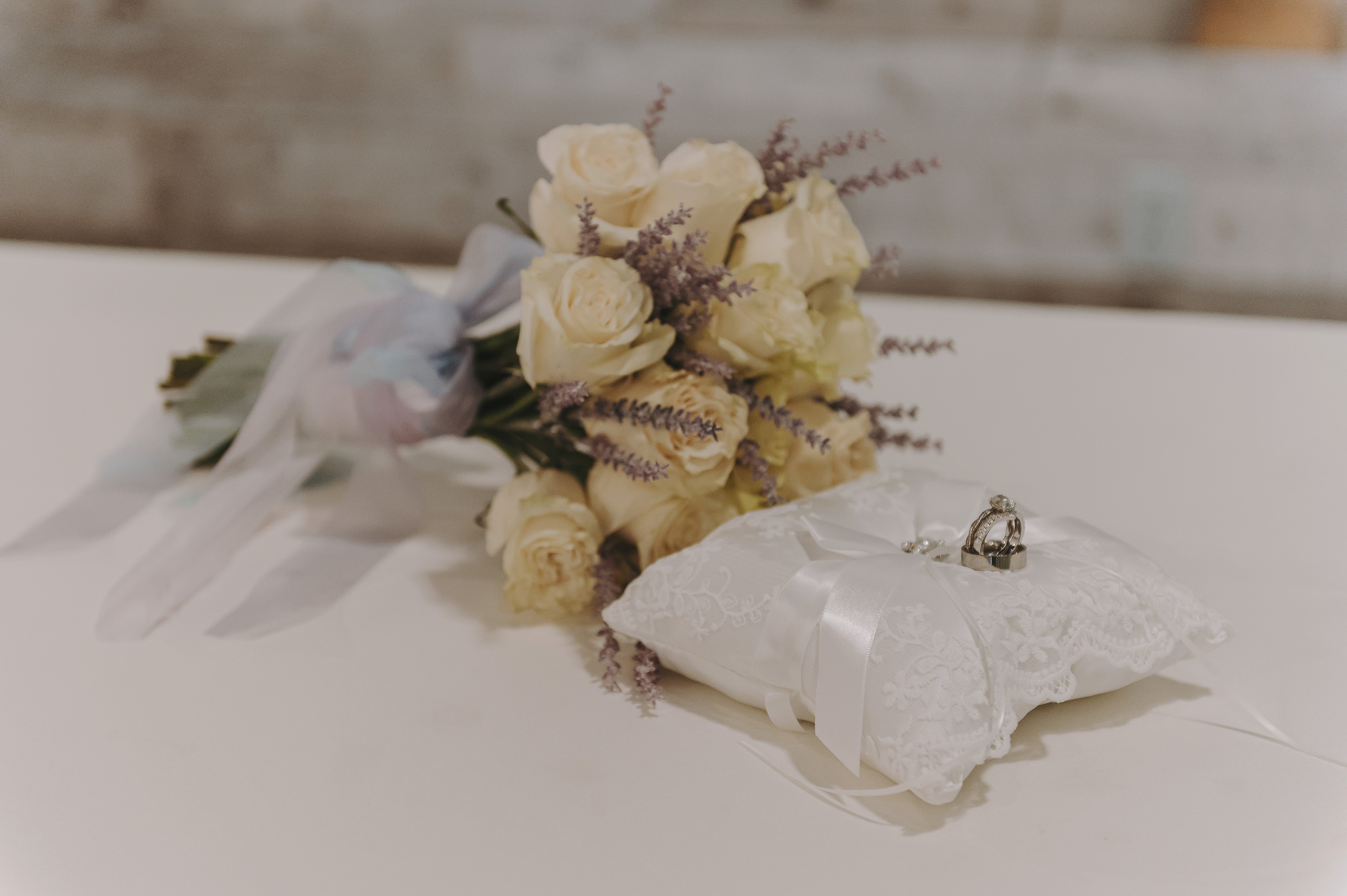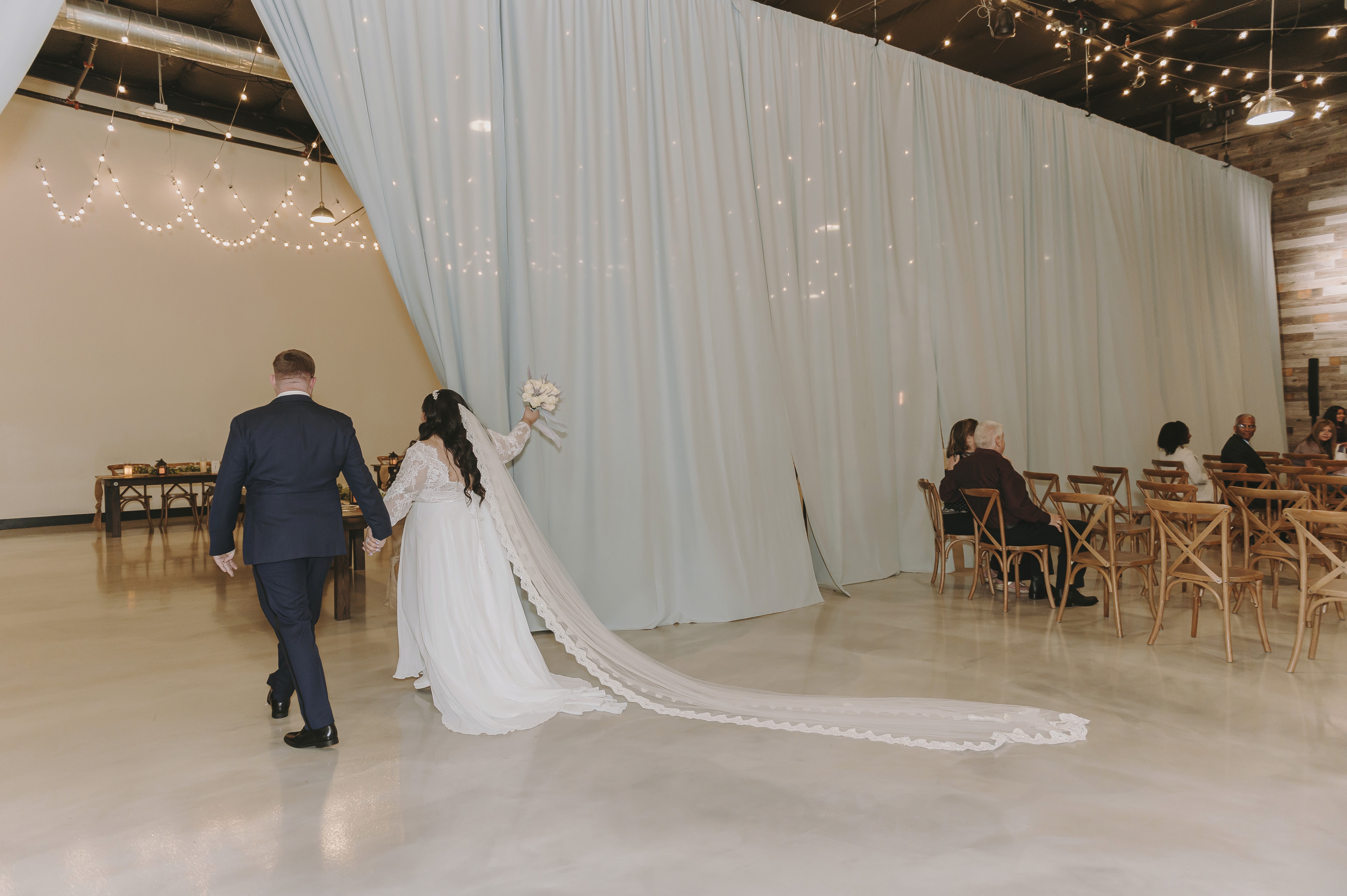 The couple leaned into a stunning color palette of Plum, Dusty Blue, and Lilac, which popped beautifully against our venue's warm wood accents and industrial-chic backdrop.